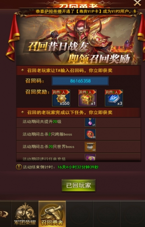 当召回玩家输入你的回归码时,你就可以获得奖励,可以专门去回归号去填写,然后按照对应的活动完成任务,可以获得对应的奖励。玩家可以获得对应的奖励道具,只要有提升等级、击杀boss、击杀世界boss、充值任意金额,等等不同的回归奖励领取。