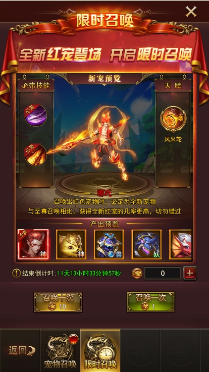 限时加入到召唤池当中,新的强力输出哪吒,红色品质的宠物,玩家可以去招募,而且是有概率可以获得的,10次抽取有概率可以获得,玩家多抽就可以获得哪吒。召唤红色宠物时,必定会出全新的哪吒,获得全新的宠物概率也会更高。