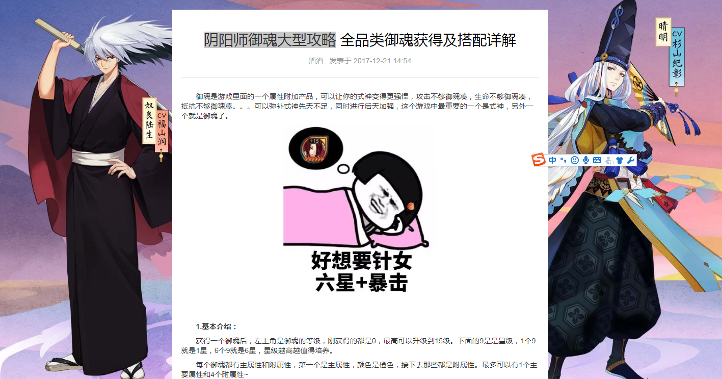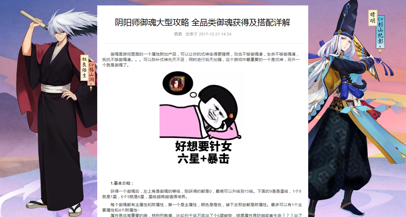 全新定制模板,从专题页面到文章页面,都是根据阴阳师特色特别定制。全网独一无二的定制版本,精心的设计,再搭配上优质全面的内容分析,受到玩家一致好评,吸引来了巨额的流量。