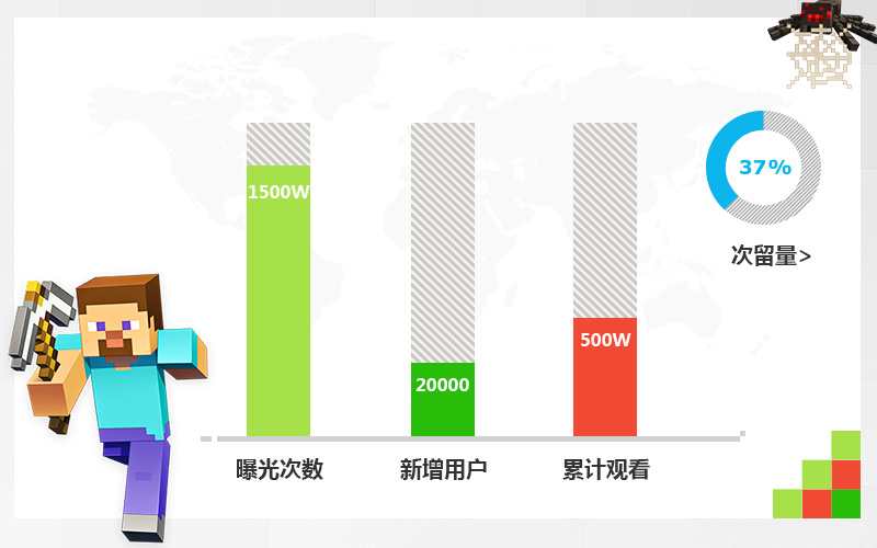 我的世界以琵琶网独有的特色专区为切入点,全站广告作为支持,再加上良好的活动策划,在上线期间获得极大的关注,曝光次数超过了1500万次,新增用户超过了20000名,而且用户的忠诚度极高,次留超过了37%,除此之外,攻略,文章以及视频累计观看数超过了500万次,极大的提升了品牌的知名度。