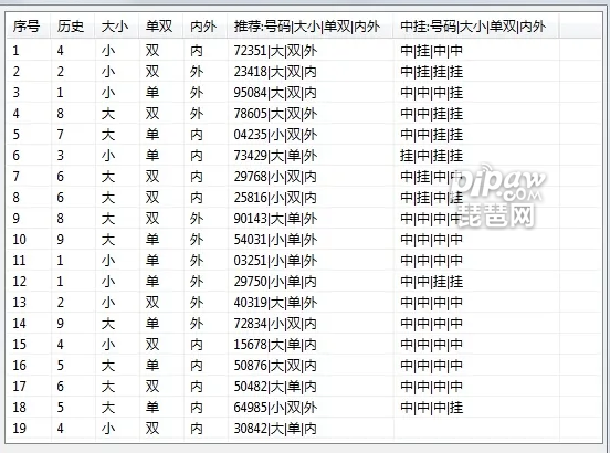 “上下”的推荐方式,就是把“0123456789”数字环分成上下两个半环,上半环是“89012”,下半环是“34567”。如果软件推荐列里推荐“上”,则是指下一个幸运数字出“89012”的概率较大,如果软件推荐列时推荐“下”,则是指下一个幸运数字出“34567”的概率较大。